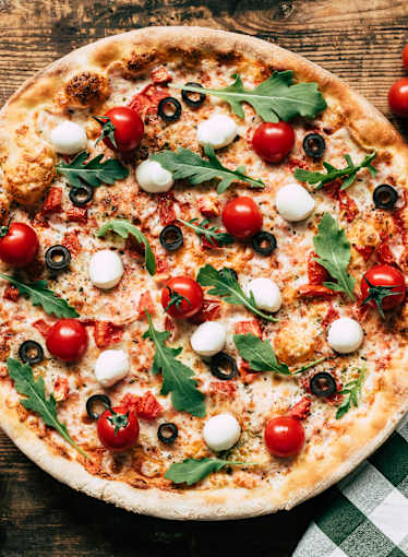 Tomato sauce, Virginia ham, sundried tomato, baby spinach, olives, feta cheese and mozzarella cheese.
